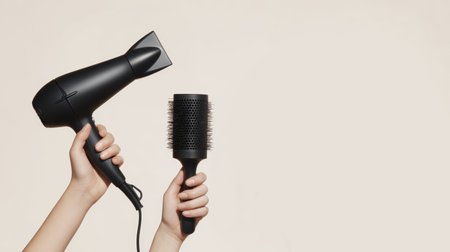 Hands holding hairdryer and brush on neutral background for hair styling concept.