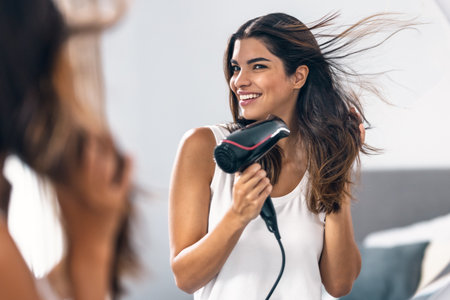 Shot of attractive woman drying her hair with a hairdryer in front of the mirror in the bathroom