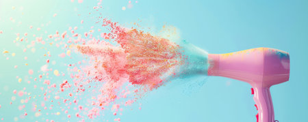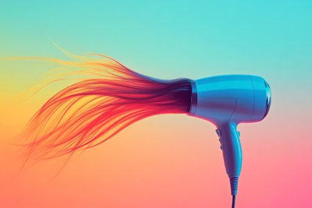 Blue hairdryer blowing vibrant long red hair against a stylish gradient background, highlighting themes of hair care and beauty