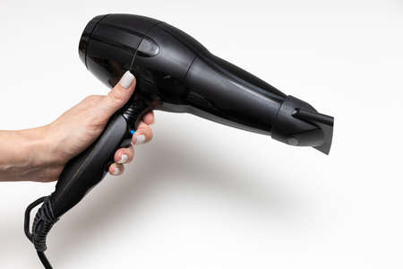 A woman's hand holds a black hair dryer on a black background. Accessory for beauty