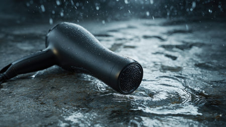 A professional hair dryer rests on a wet surface, surrounded by raindrops, showcasing an artistic blend of beauty and technology, ideal for creative projects.