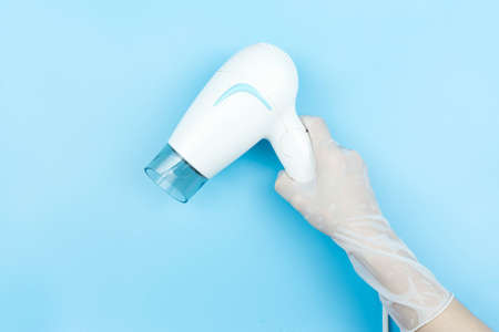 Hand in white medical gloves holding Hair dryer on blue background,Virus protection under an outbreak