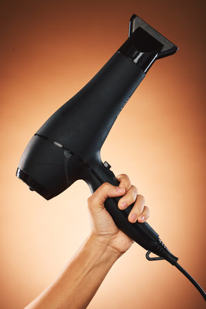 Hair, hand with hair dryer and hair care with beauty and cosmetic advertising against orange studio background. Salon, hairdressing and hairstyle tool or appliance with cosmetics marketing.