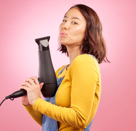 Hairdryer, salon and funny with portrait of woman in studio for hairdresser, beauty and cosmetics. Shampoo, hair care and hairstyle with face of asian person on pink background for product and gun