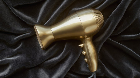 A luxurious gold hair dryer resting gracefully on a soft black fabric, perfect for beautifying a bathroom or salon space. Ideal for advertisements or decor.