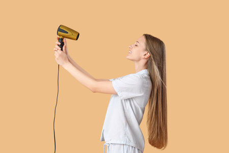 A young woman dries her hair with a hairdryer isolated on a beige wall background. Art. Young blond woman in a white shirt styling her hair.
