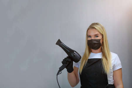 Hairdressing salon opened. Hairdresser with security measures for Covid-19, a woman in a medical mask, social distance, cutting hair with a medical mask and rubber gloves in a beauty salon