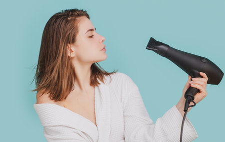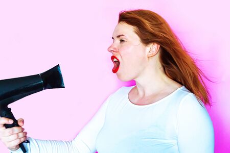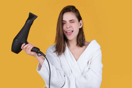 Young funny woman using hair dryer. Health hair and beauty concept.