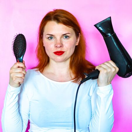 Happy young ginger woman with hair dryer on blue mint background. Hair style beauty concept