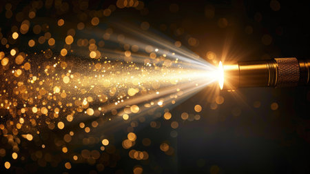 Flashlight producing golden magic light beams, sparkles and glitter illuminating the night with bright energy and highlights