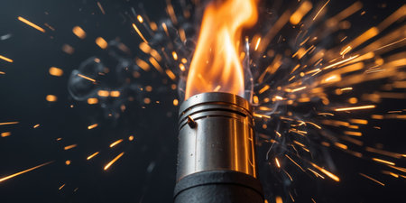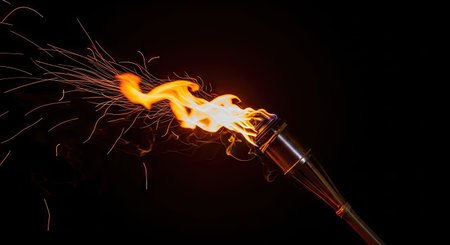 A dramatic close-up of a torch or welding tool emitting a powerful burst of flames and sparks against a dark background. ideal for design projects requiring energy, heat, or industrial themes. Generative AI