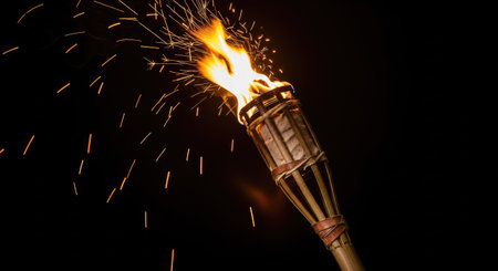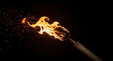 A bright flame flickers and twists from a torch illuminating the surrounding darkness. The warm glow contrasts against the shadows creating a captivating atmosphere.