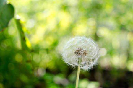 White light dandelion on green blur background. Soft selective focus. Photo taken on an old lens with an interesting bokeh