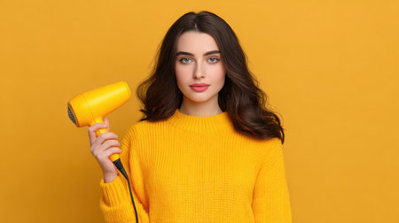 A young woman stands confidently, holding a bright yellow hair dryer against a matching vibrant background. This image captures beauty, style, and modern fashion.