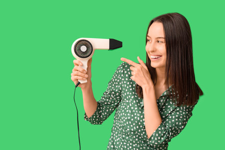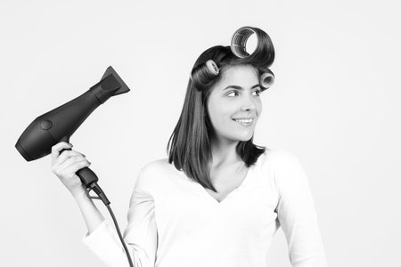 Young woman using hair dryer. Hairstyle, hairdressing concept.