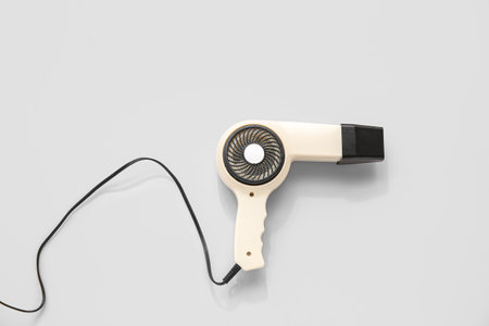A sleek hair dryer stands against a plain backdrop, illustrating its readiness for use in personal styling and grooming activities.