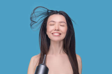 Woman with hair dryer. Beautiful girl with straight hair drying hair with professional hairdryer. Isolated on blue background.