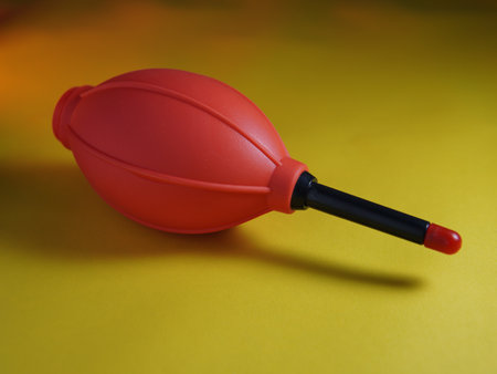 Red rubber blower on a yellow background, close-up. red silicone dust blower for cleaning camera on yellow background