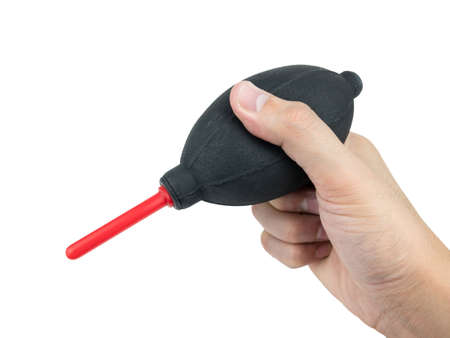 Hand holding Silicone blower or Rubber air blower Pump Dust Cleaner for camera and lenses isolated on white background, Clipping path.