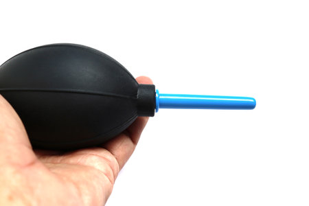 hand holding black rubber ball for cleaning camera lens on white background