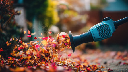 A powerful leaf blower sends vibrant autumn leaves swirling off a garden pathway, showcasing nature's beauty and seasonal changes.