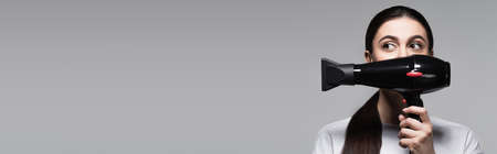 young woman in white t-shirt covering face with hair dryer isolated on grey, banner