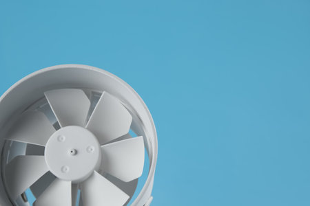 Modern electric fan on light blue background. Space for text