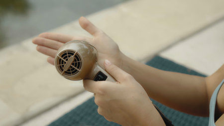 Hair care. Female hands holding hairdryer on red background. Top view