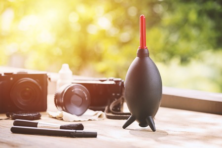 Camera and lens care. Camera cleaning kits and camera gears on wooden desk.