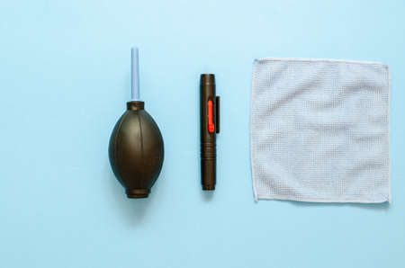 Pear for cleaning the optics on a blue background. The removal of dust particles from the lens.