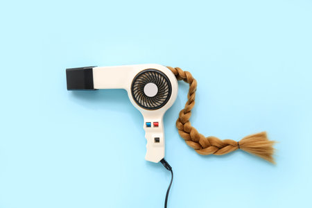 Hair dryer and plait on light blue background