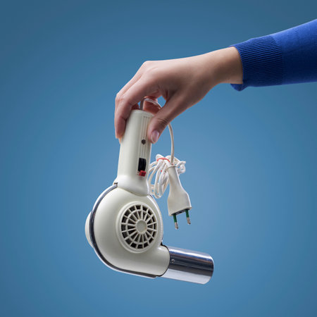 This stylish hair dryer showcases a sleek design with striking light and shadow patterns, perfect for beauty, interior, and product photography.