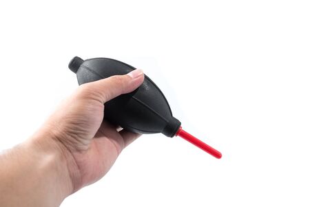 Camera lens cleaning blower in hand isolated on white background closeup.