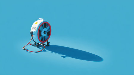 A visually striking vintage fan stands against a vibrant blue background, highlighting its design and colorful cables, perfect for home decor inspirations and creative projects.