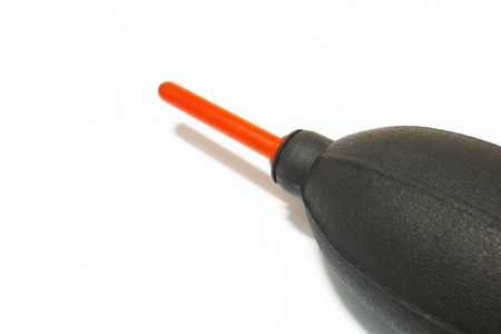 Camera lens cleaning blower with copy space isolated on white background closeup.
