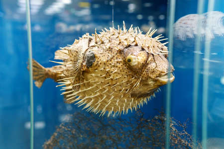 porcupine fish, on a blue background. exhibition of marine animals