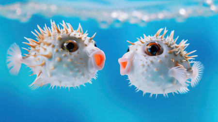 Two charming pufferfish are seen swimming together in clear blue water, showcasing their delicate spines and vibrant eyes. This image captures the beauty of marine life.