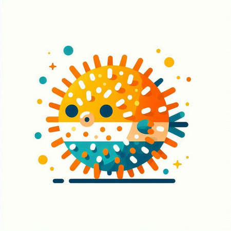 A charming illustration of a pufferfish with a spiky exterior, set against a gradient backdrop of pink and blue.