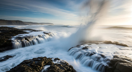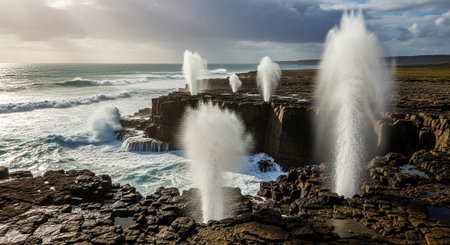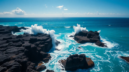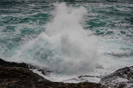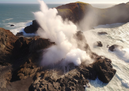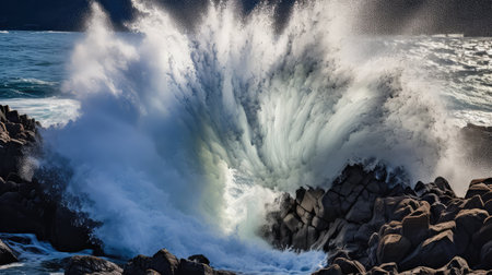Experience the breathtaking beauty of powerful ocean waves exploding into stunning water geysers, creating dramatic clouds and frothy sprays against a deep blue sea.