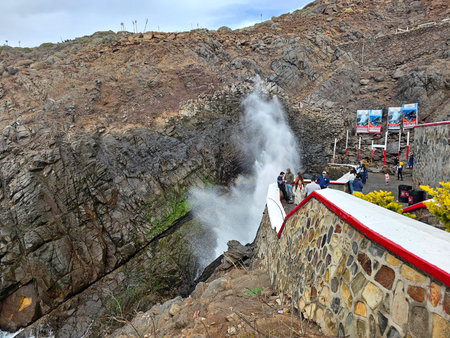 Ensenada, Baja California, Mexico - Mar 17 2025: La Bufadora is a marine geyser with a powerful jet of water and a loud sound, an important tourist attraction in Ensenada