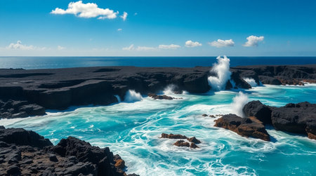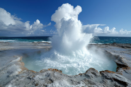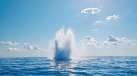 A mesmerizing scene of a water splash erupting from the calm ocean under a brilliant blue sky with fluffy clouds. Perfect for summer themes.