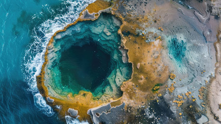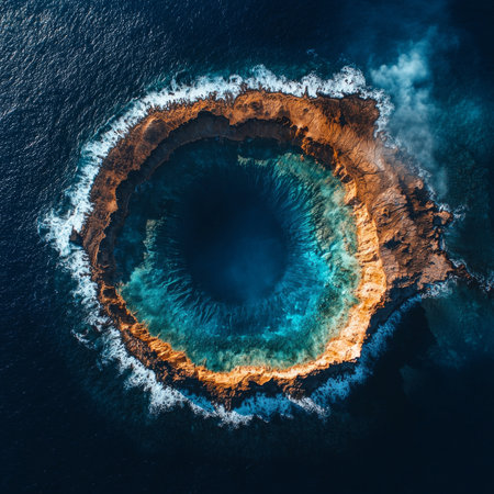 Jagged, dark rocks with orange hues surround a circular opening in the ocean, where turquoise water swirls and splashes, creating a dynamic vortex.