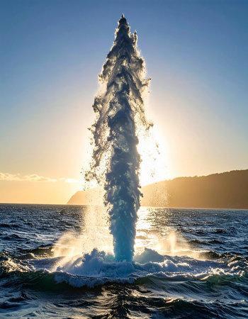 As the sun dips below the horizon, casting a golden glow across the tranquil ocean, a majestic whale announces its presence with a powerful spout.