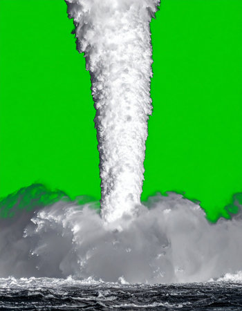A massive, powerful waterspout churns the dark, chaotic ocean below. This realistic visual effect element, isolated on a green screen background, is perfect for compositing into scenes depicting natural disasters, extreme weather events, or cinematic apocalyptic scenarios. The sheer force and scale of the vortex create a sense of awe and danger.