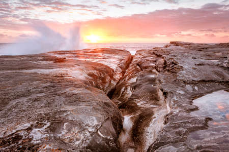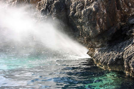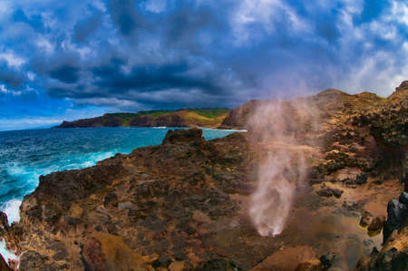 Water blown out from blow hole caused from a Pacific Ocean wave on the Maui coastline, Hawaii, USA