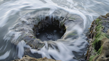A close-up photo showing white, rushing water swirling and moving through a dark, rocky hole in the ocean. The water is blurred from the motion of the waves. Green moss covers the edge of the rock formation.
