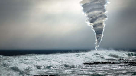 Dangerous storm with powerful tornado twister over the ocean in the background. Extreme weather, climate change and global warming concept montage.