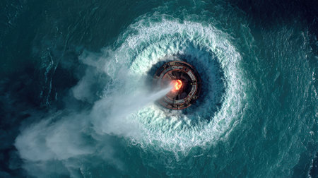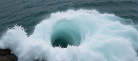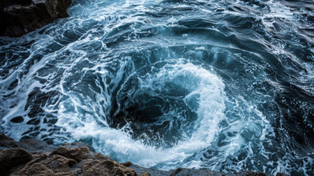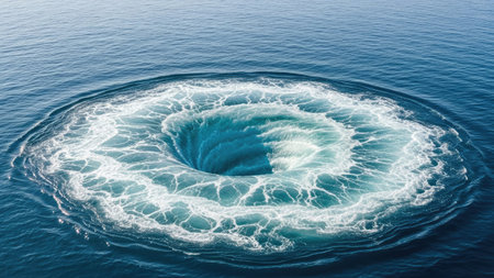 An immense natural ocean whirlpool creates a captivating vortex of rapidly swirling water. The aerial perspective highlights the dynamic movement of the deep blue water and frothy white foam.