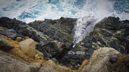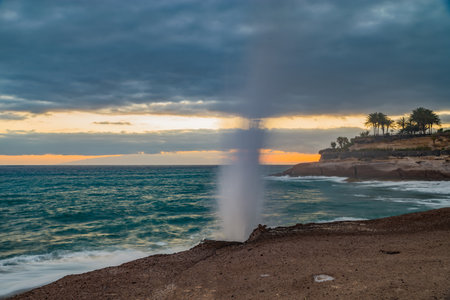 Ensenada, Baja California, Mexico - Mar 17, 2025: La Bufadora, a marine geyser in Ensenada, Baja California, Mexico. A natural show of the sea ejecting upwards, creating giant jet