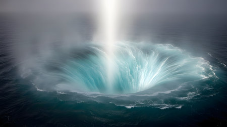A massive, swirling whirlpool forms a deep sinkhole in the dark ocean, illuminated by a mysterious beam of light from above. The dramatic and surreal scene conveys the overwhelming power of nature and the mysteries of the deep sea.